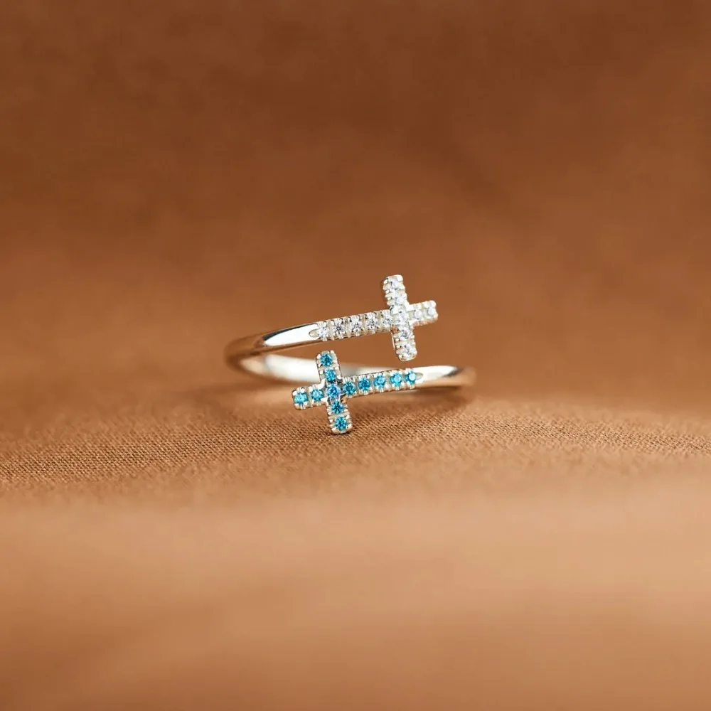 Sterling Silver CZ Double Cross Open Ring Wholesale, Religious Jewelry Wholesale